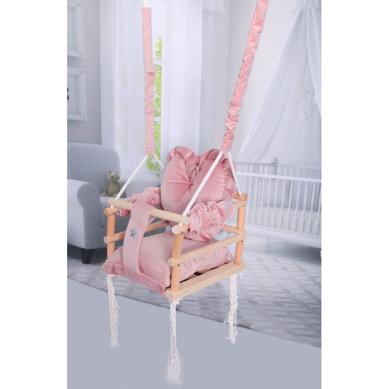 Maar uiterlijk is dit niet alles: de schommel heeft ook een heel veilig ontwerp. Wat heb je aan een mooie schommel als je kind er als een Superman uitvliegt? Alle hoeken van de schommel zijn rond en het houten frame is zeer precies gepolijst. De bedekking van de touwen en de kussentjes zijn gemaakt van enkel het beste Cleanaboo-materiaal: fluweelachtig en pluche tegelijkertijd. Dit materiaal zorgt ervoor dat vocht niet direct in de stof trekt en de schommel makkelijk schoon te houden is. Niet alleen een veilige schommel, maar ook nog eens een schone schommel. Jij blij, je kind blij, iedereen blij.