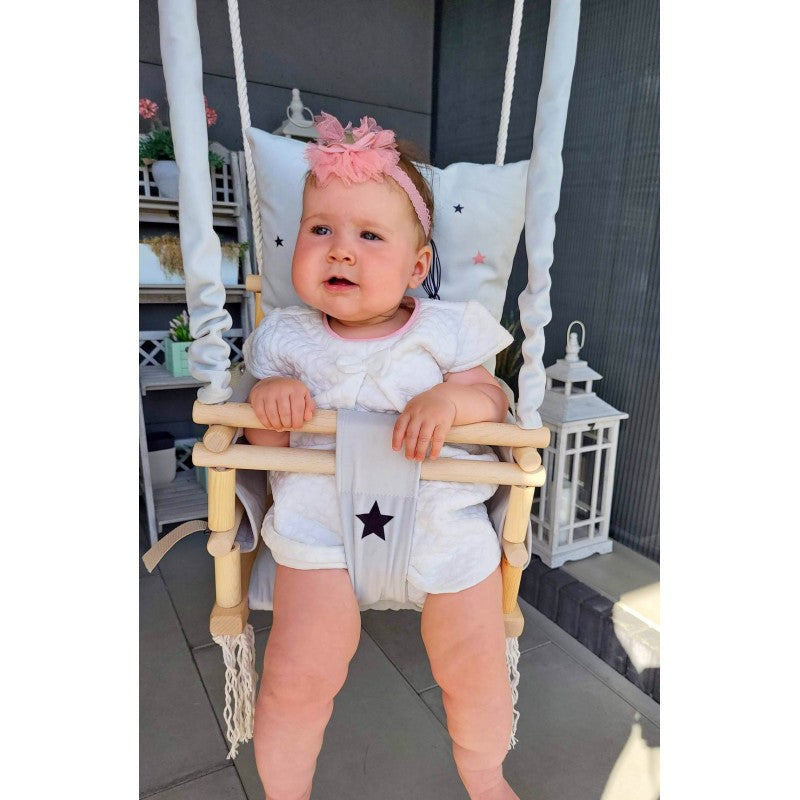 Maar uiterlijk is dit niet alles: de schommel heeft ook een heel veilig ontwerp. Wat heb je aan een mooie schommel als je kind er als een Superman uitvliegt? Alle hoeken van de schommel zijn rond en het houten frame is zeer precies gepolijst. De bedekking van de touwen en de kussentjes zijn gemaakt van enkel het beste Cleanaboo-materiaal: fluweelachtig en pluche tegelijkertijd. Dit materiaal zorgt ervoor dat vocht niet direct in de stof trekt en de schommel makkelijk schoon te houden is. Niet alleen een veilige schommel, maar ook nog eens een schone schommel. Jij blij, je kind blij, iedereen blij.