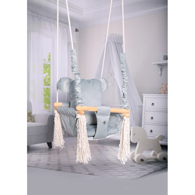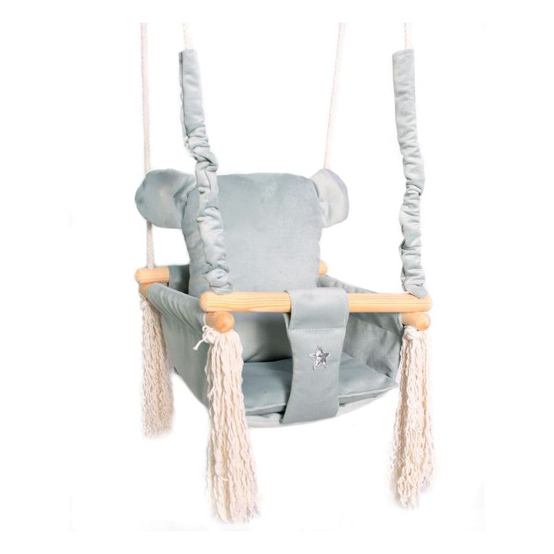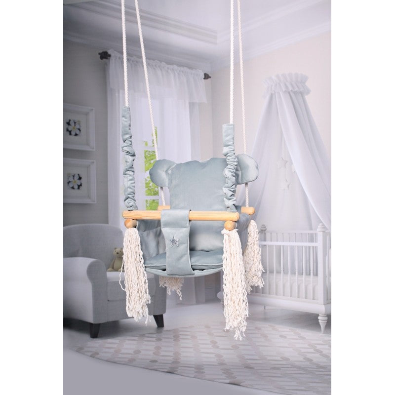 Luxe houten beer handgemaakte licht grijze babyschommel/ kinderschommel met beer oor vormig kussen