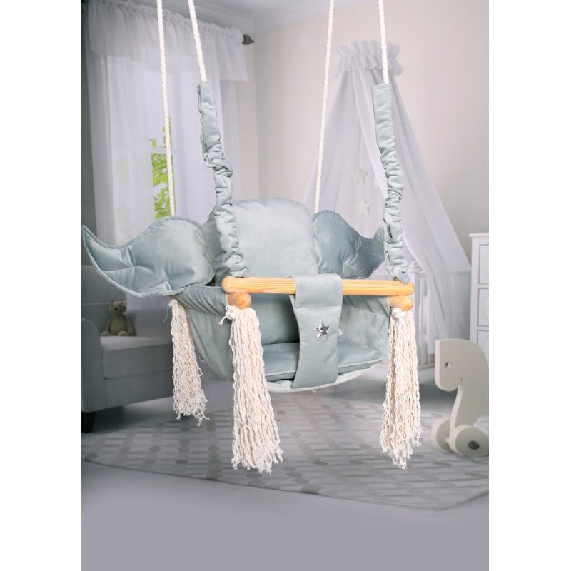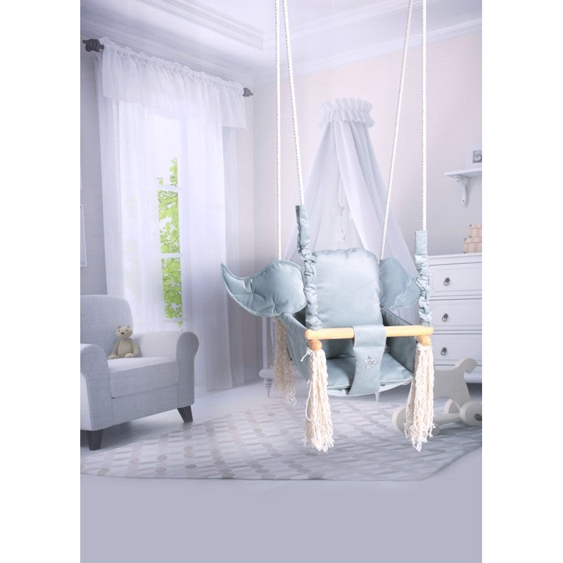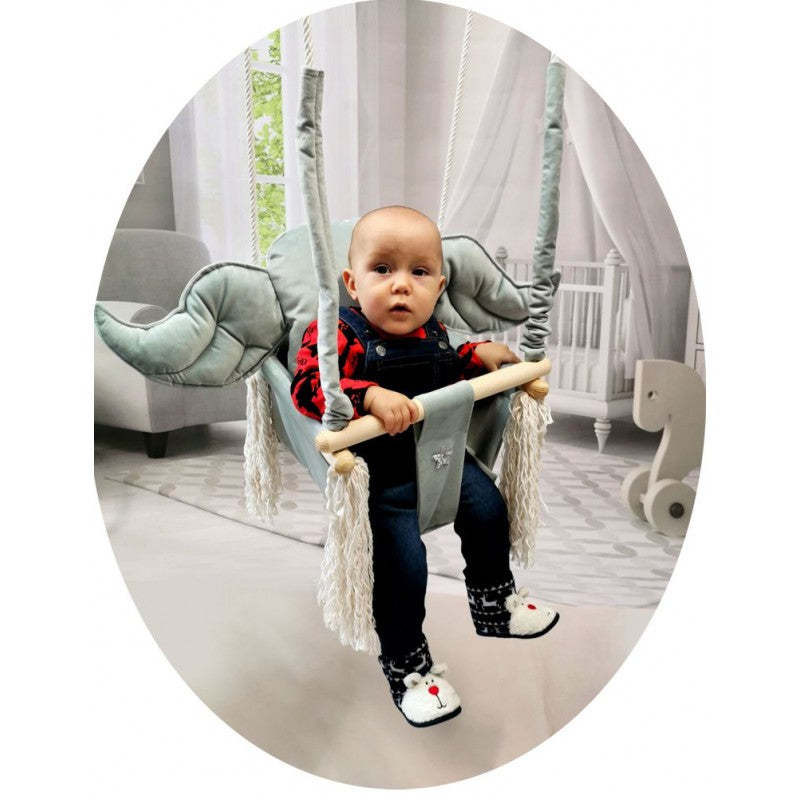 Over deze kinderschommel met olifant oor vormig kussen