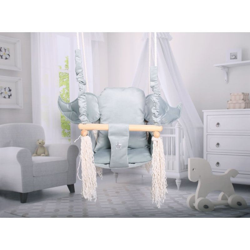 Luxe houten olifant handgemaakte licht grijze babyschommel/ kinderschommel met olifant oor vormig kussen