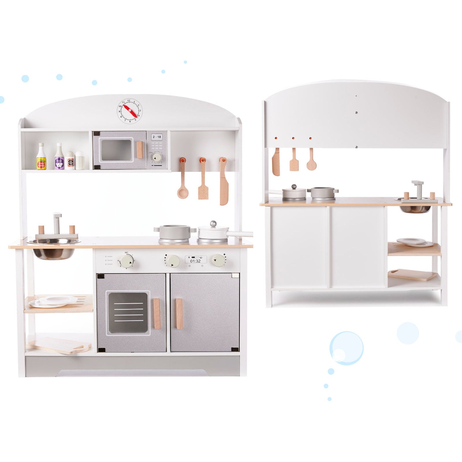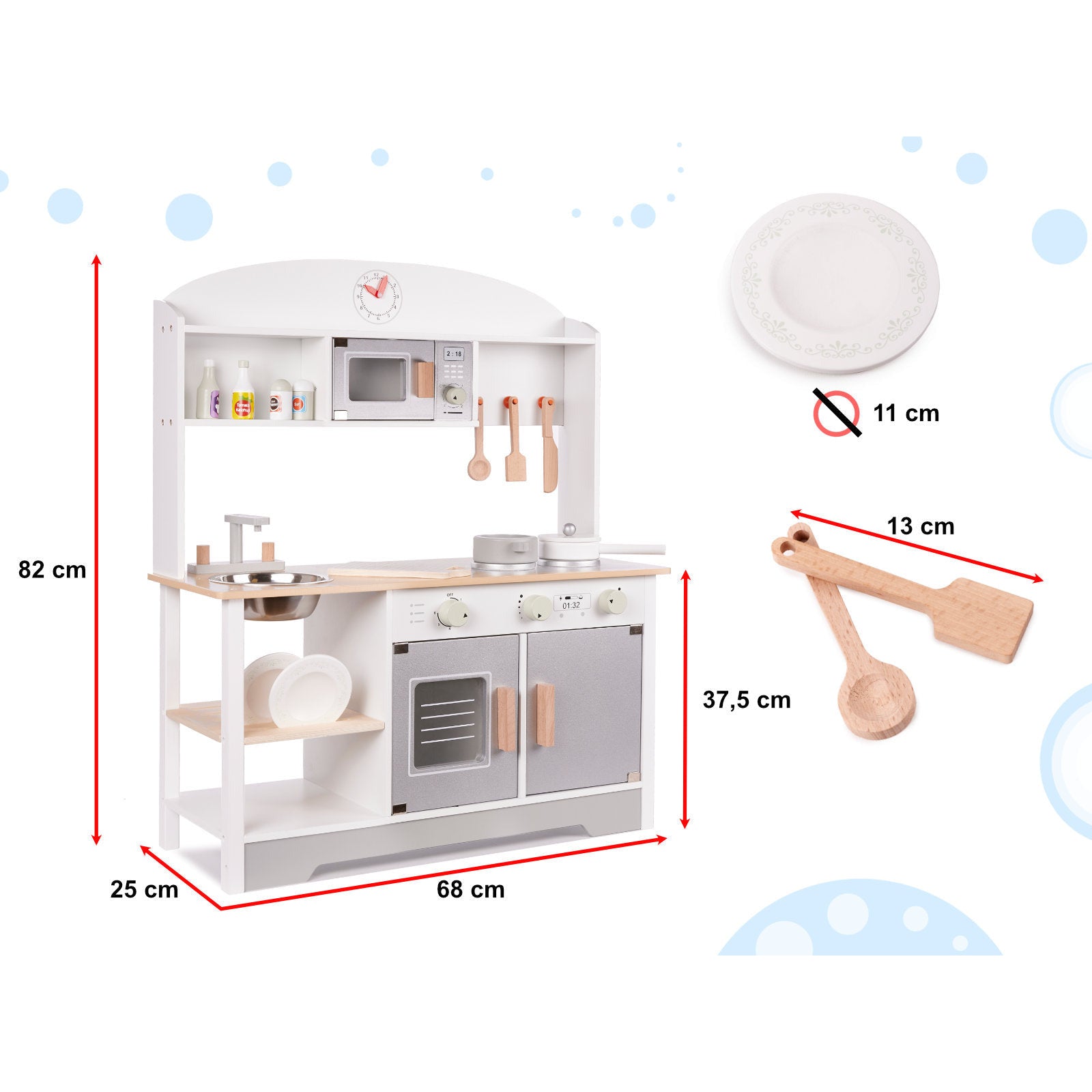 De metalen spoelbak is afneembaar - je kunt hem vullen met water om fruit of groenten te wassen. We raden echter aan voorzichtig te zijn wanneer houten elementen in contact komen met water - het kan ze beschadigen. Draaibare knoppen, beweegbare deuren, haken, - veel kleine elementen waar kleine handjes bij betrokken zijn. Door hun hantering kun je grip en fijne motoriek ontwikkelen.