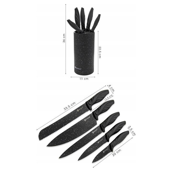 Het messenblok heeft een doorsnee van 11 cm, een hoogte van 22,5 cm en een totale hoogte van 36 cm.