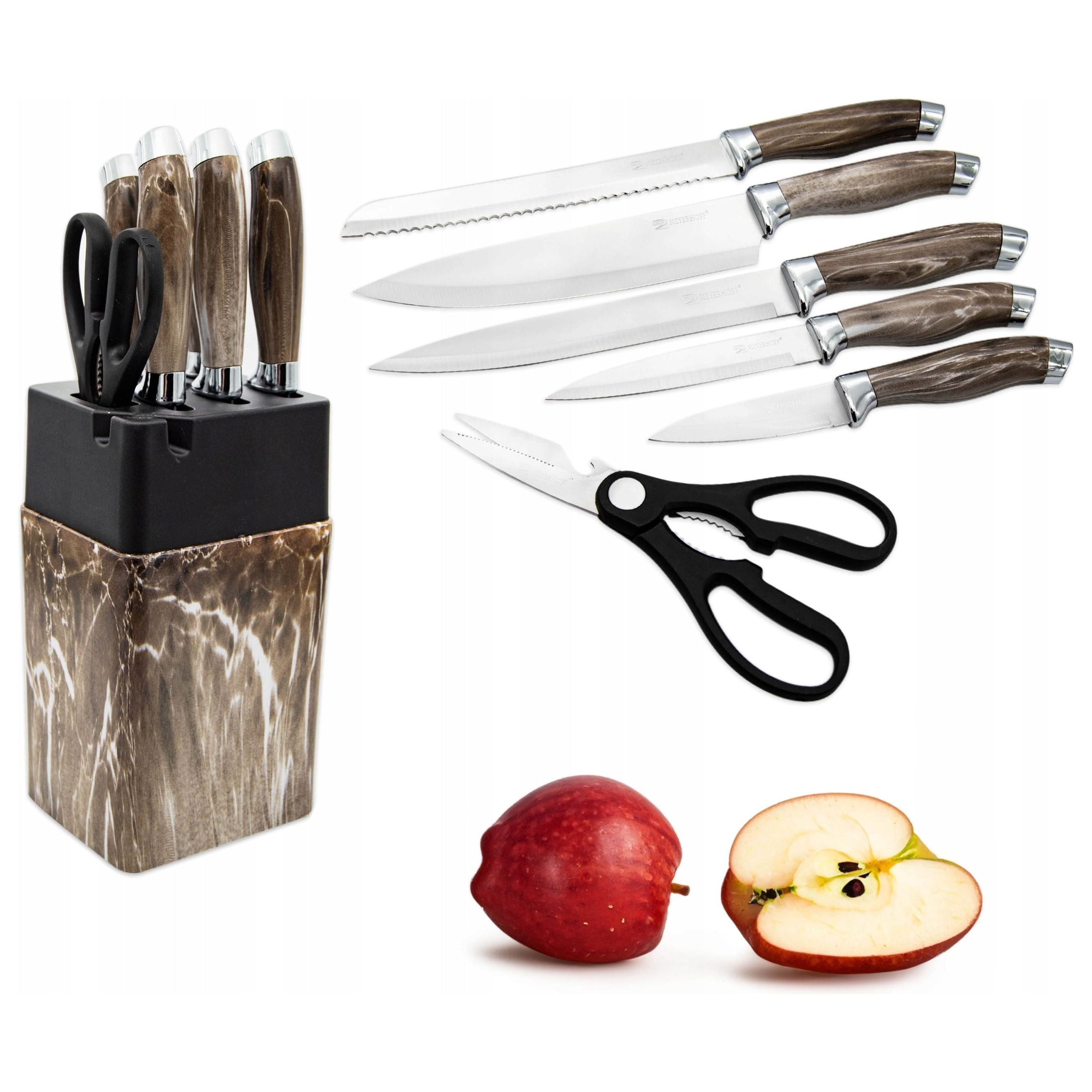De set bestaat uit vijf keukenmessen, een multifunctionele keukenschaar en een stabiel messenblok met opbergfunctie.