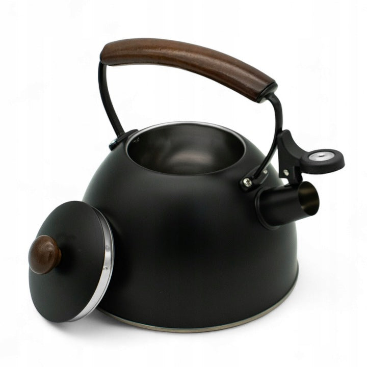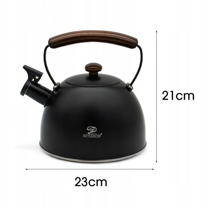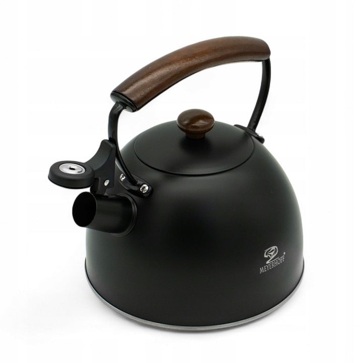 Met deze Meyerhoff fluitketel van 2,5 liter, gemaakt van hoogwaardig roestvrij staal (RVS) in mat zwart, combineer je stijl en functionaliteit. Dankzij de solide bodem en degelijke afwerking is hij geschikt voor alle warmtebronnen — gas, elektrisch, keramisch én inductie. De houten handgreep blijft koel in de hand en het fluitje waarschuwt je wanneer het water kookt. Ideaal voor jouw dagelijkse kop koffie of thee, zonder gedoe.