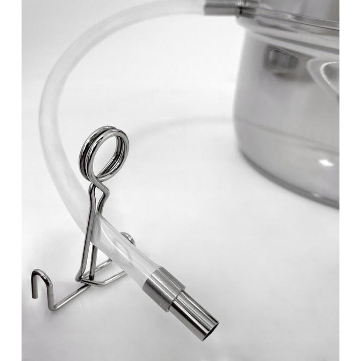 Een waterpan, sapopvangpan, fruitcontainer met zeef, glazen deksel, siliconenslang en klem.