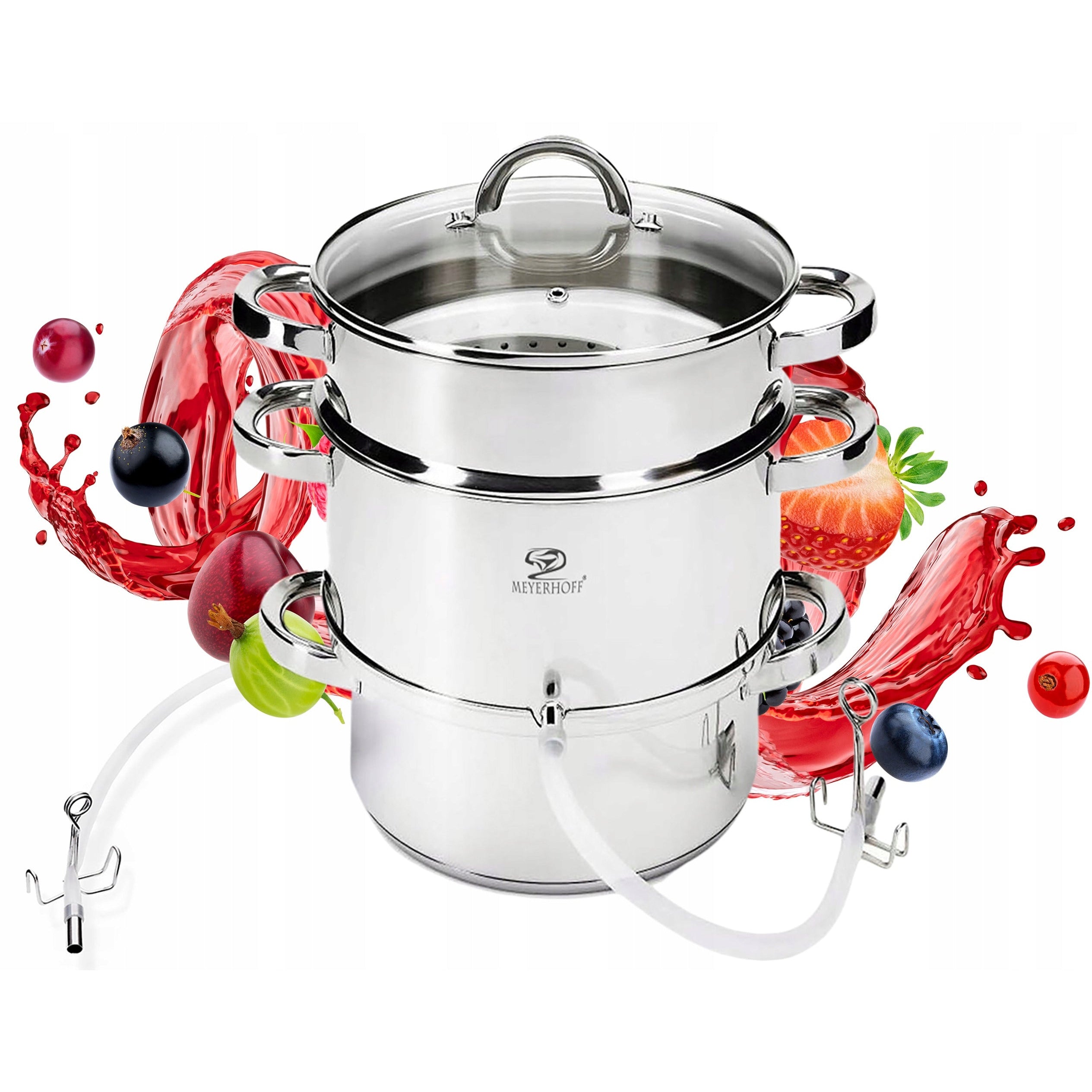 Geen ruimte of zin in een log elektrisch sapapparaat? Met de Meyerhoff professionele sapcentrifuge pan 8 liter maak je zelf eenvoudig verse sappen van groente of fruit – gewoon op het fornuis. De 6-delige RVS juicer bestaat uit een waterpan, opvangpan en fruitcontainer met zeef, plus een glazen deksel, siliconenslang en klem om het sap direct af te tappen.