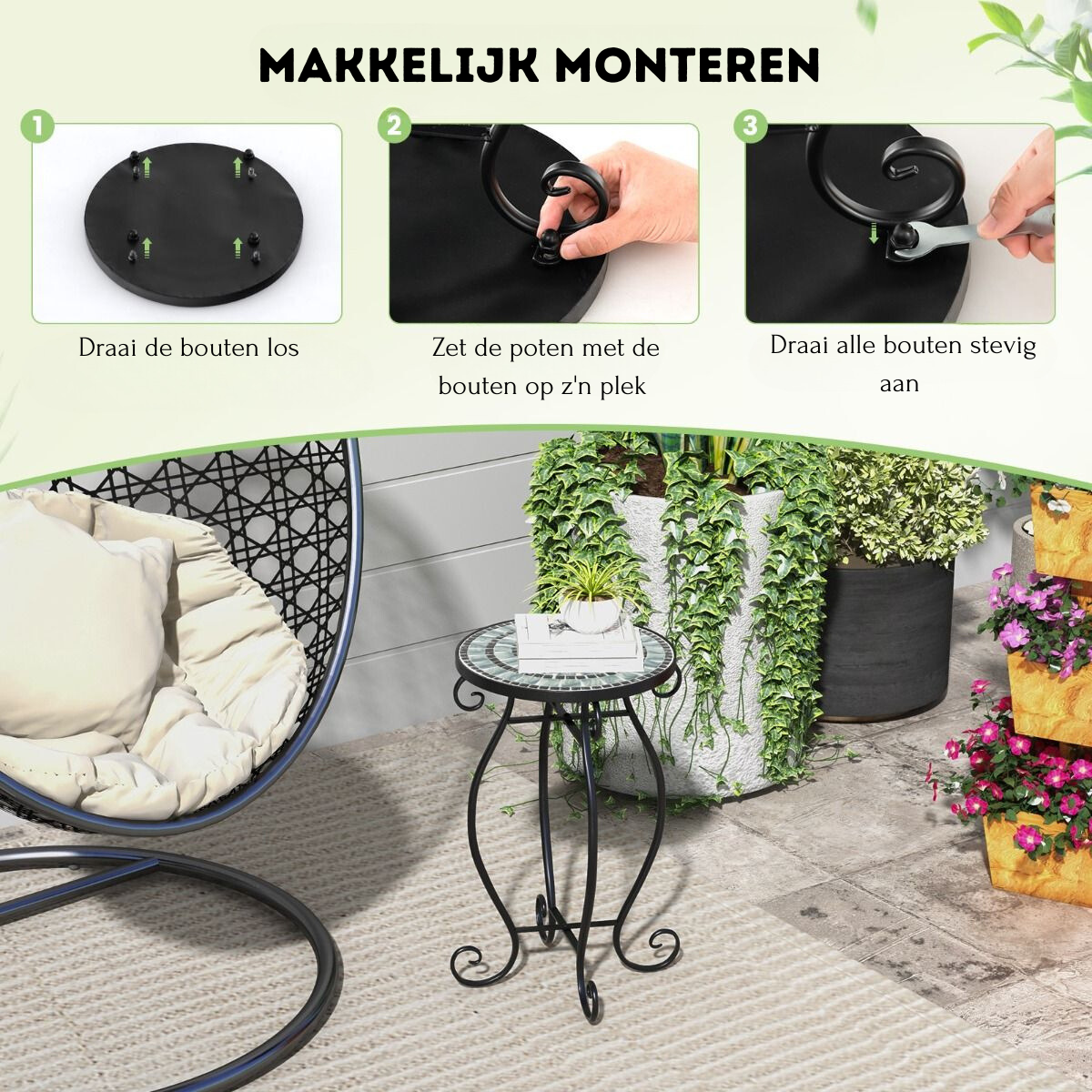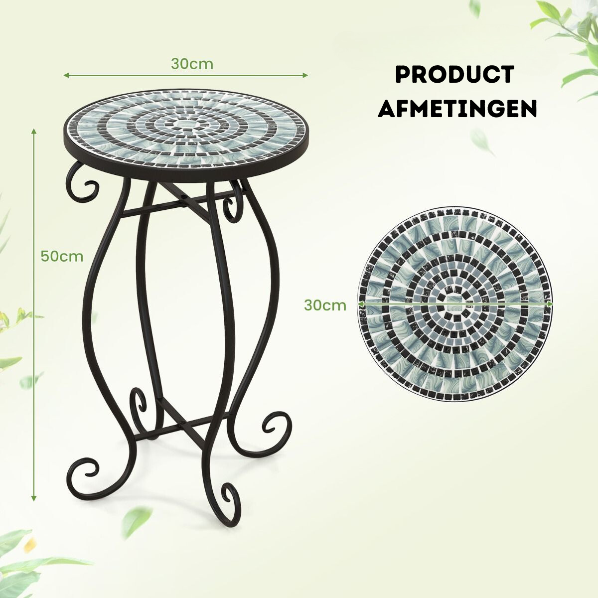 Of je nu een gezellig balkon wilt inrichten, een stabiele plantenstandaard zoekt of gewoon een stijlvol tafeltje voor binnen, deze Trendmix mozaïek bijzettafel is jouw oplossing. Compact, stevig, elegant en onderhoudsvriendelijk – alles wat je zoekt, in één meubel.