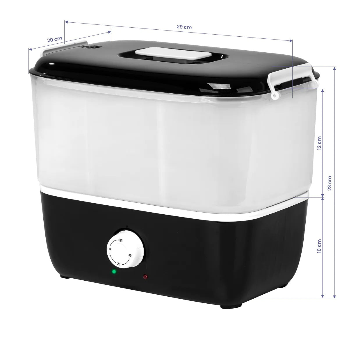 De handdoekwarmer heeft een timer waarmee u de verwarmingstijd kunt instellen op 10, 20 of 30 minuten. Het apparaat schakelt automatisch uit wanneer de tijd verstrijkt, wat de veiligheid garandeert. Daarnaast heeft het LED-indicatielampjes en minimale en maximale vulniveaumarkeringen voor gemak en veiligheid in gebruik.