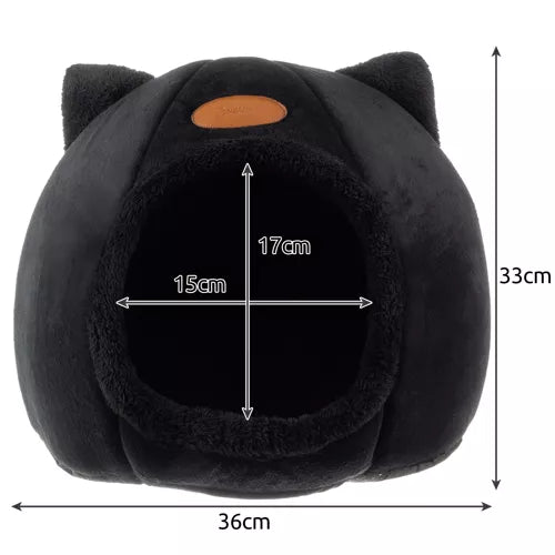 Dit kattenhuisje is zwart van kleur en gemaakt van polyester, PP-katoen en EVA-schuim. Het kan een maximaal diergewicht van 6 kg dragen en heeft een openingsmaat van 15 x 17 cm. De afmetingen zijn 36 x 33 cm en het weegt 352 gram. In de verpakking weegt het 406 gram.