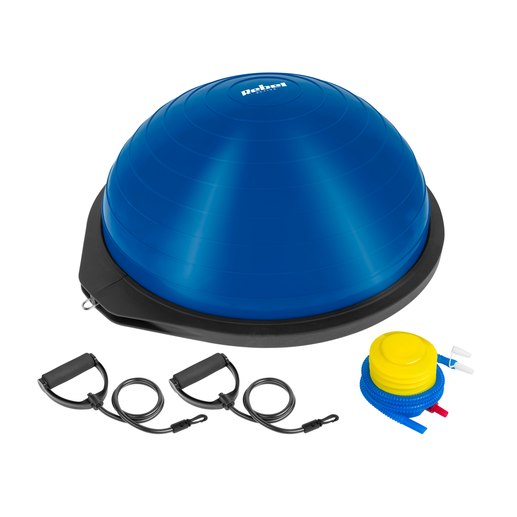 De set van de Rebel Active halfbalansbal bevat naast de bal ook een voetpomp en 2 weerstandsbanden. De weerstandsbanden zijn afneembaar en zorgen voor nog meer variatie in de trainingen.