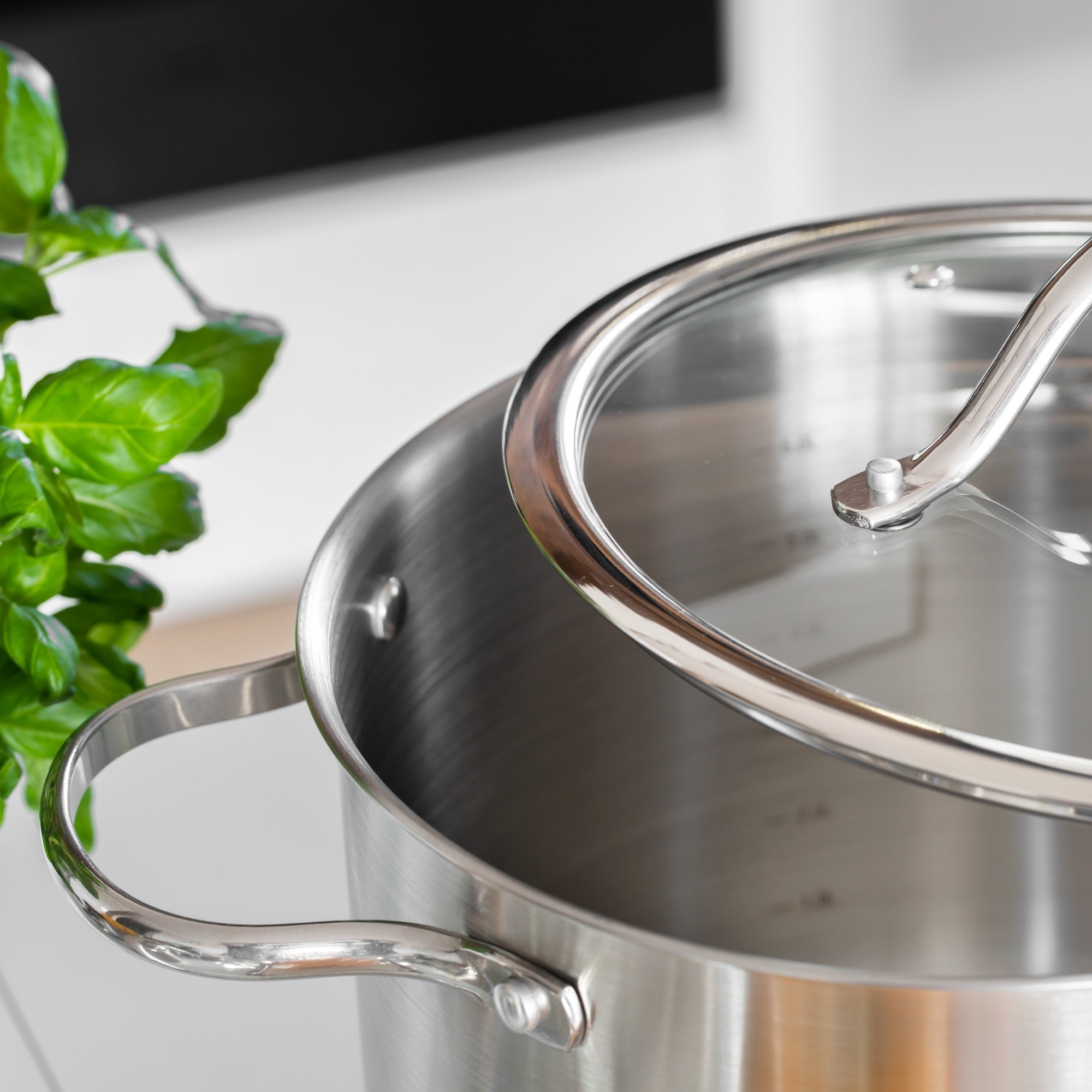 De meerlaagse onderkant van de pannen zorgt voor een perfecte warmtegeleiding en houdt de warmte goed vast, waardoor je gerechten gelijkmatig worden verwarmd.