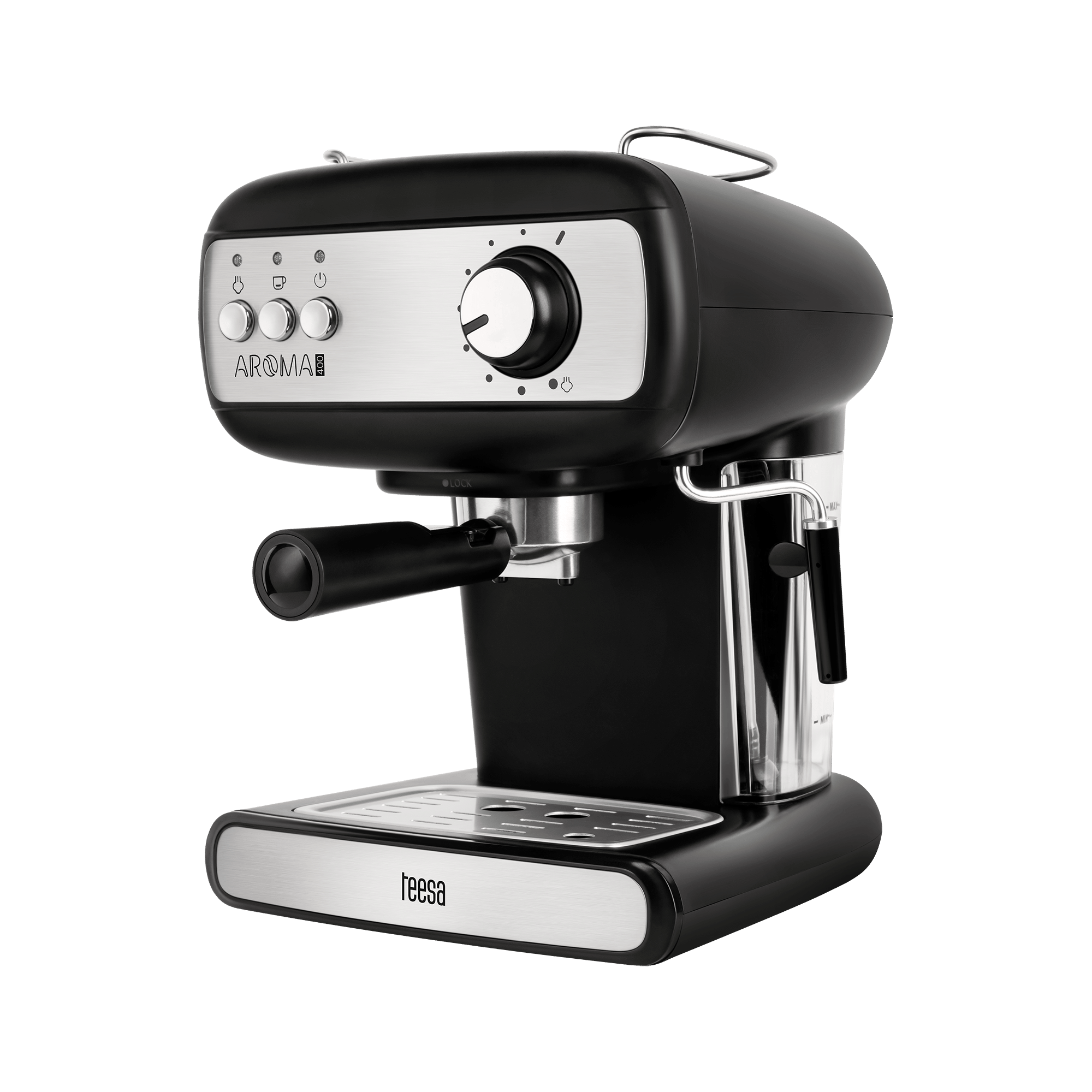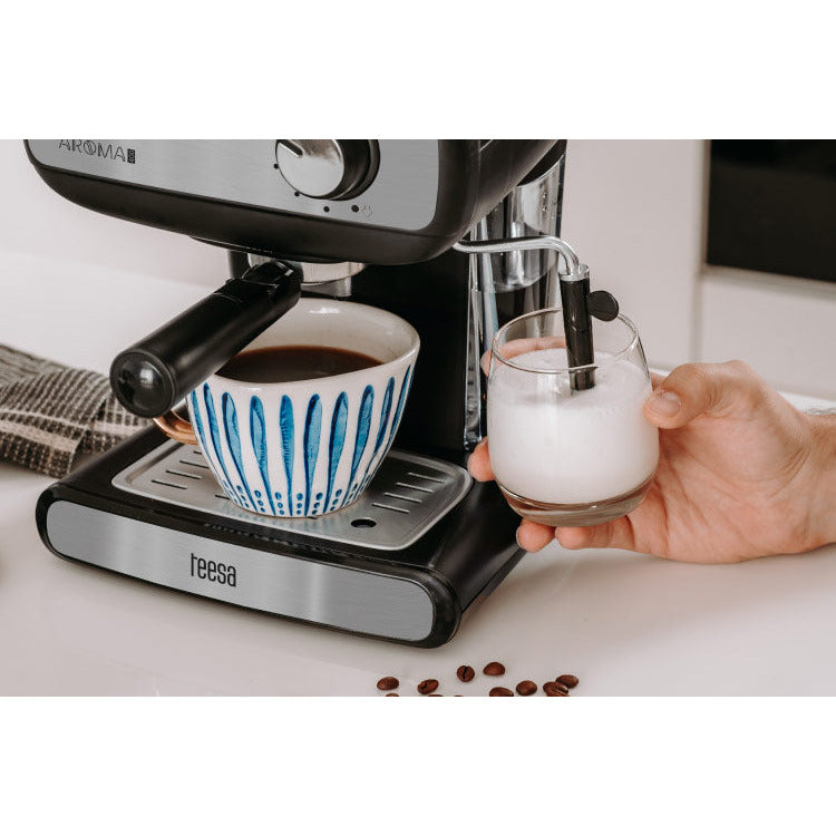 Wordt wakker met de geur van verse koffie! Met de TSA4009 AROMA 400 espressomachine van Teesa maakt u thuis koffie als een echte barista! Meet de juiste hoeveelheid gemalen koffie, druk deze goed aan en plaats de koffiehouder onder de machine.