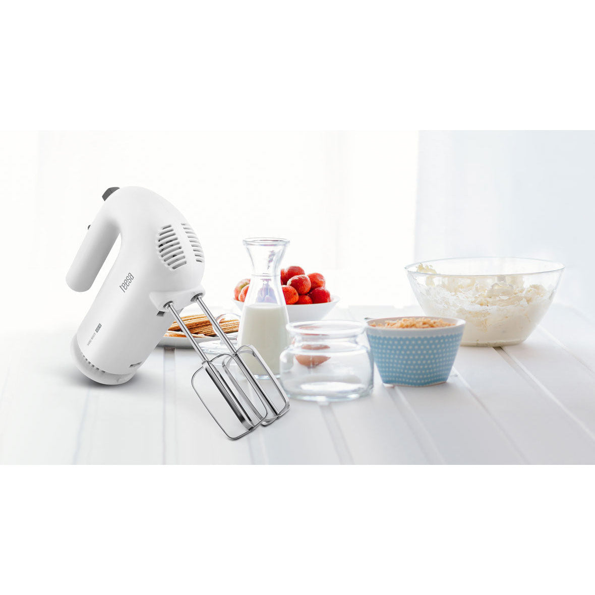 Met de TSA3536 handmixer van Teesa kunt u zonder moeite heerlijke desserts serveren aan uw gasten. Dit compacte apparaat biedt een vermogen van 400 Watt, waardoor u snel en gemakkelijk zelfgemaakte lekkernijen kunt bereiden. De handmixer heeft vijf snelheden en een turbofunctie, en wordt geleverd met een set kloppers en een set kneedhaken.