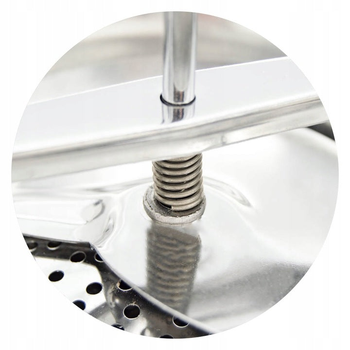 De hele zeef, inclusief mes en zeven, is gemaakt van hoogwaardig roestvrij staal – duurzaam en voedselveilig.