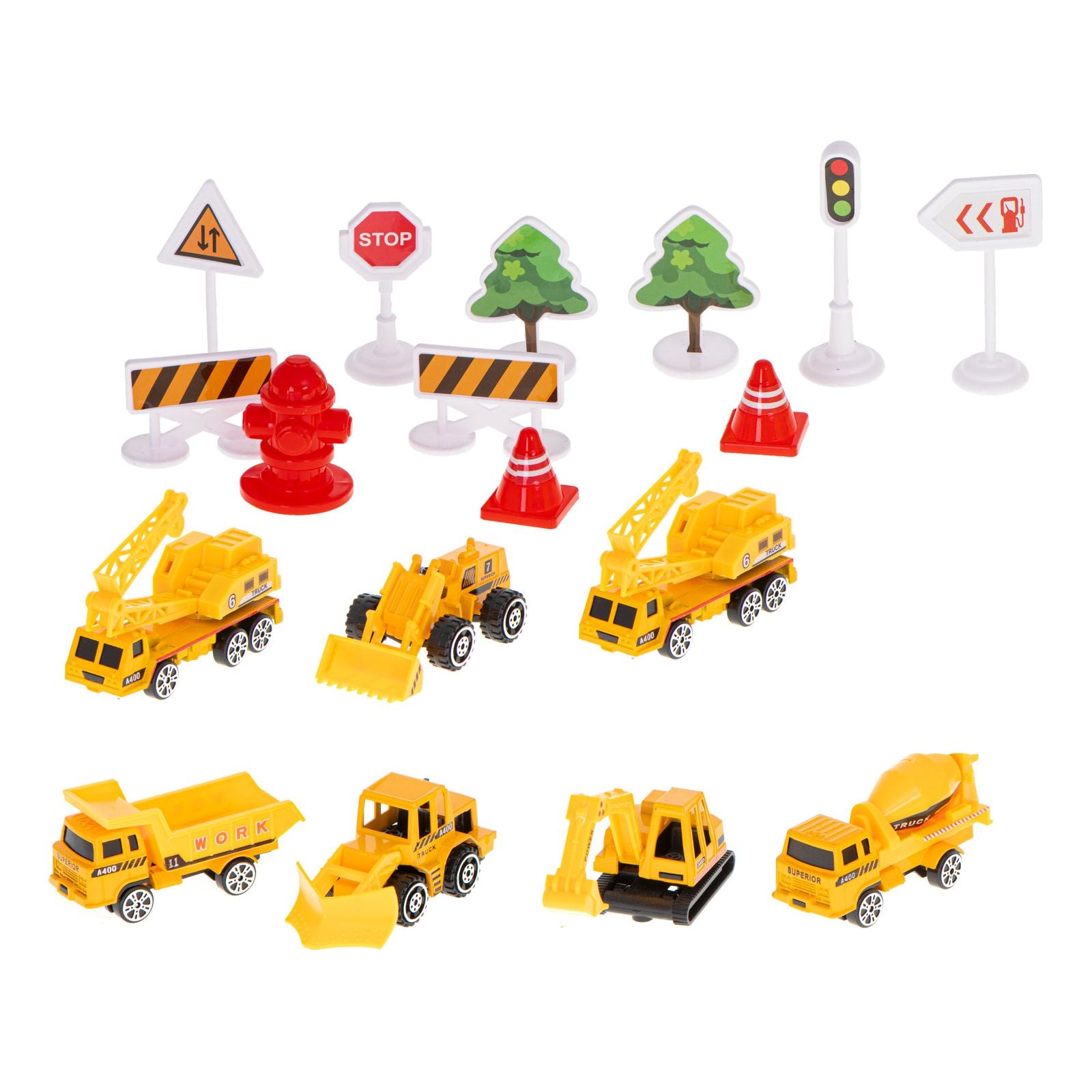 De set bevat een transportvliegtuig en maar liefst 6 verschillende bouwvoertuigen, waaronder een graafmachine, betonmixer vrachtwagen, bulldozer, vrachtwagen, kraan en meer. Ook zijn er bomen, kegels en een stickerset inbegrepen.