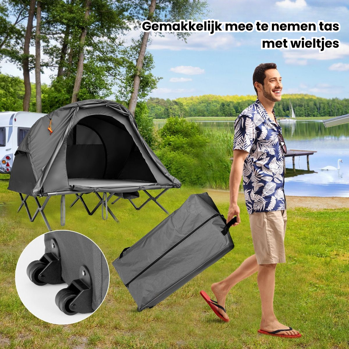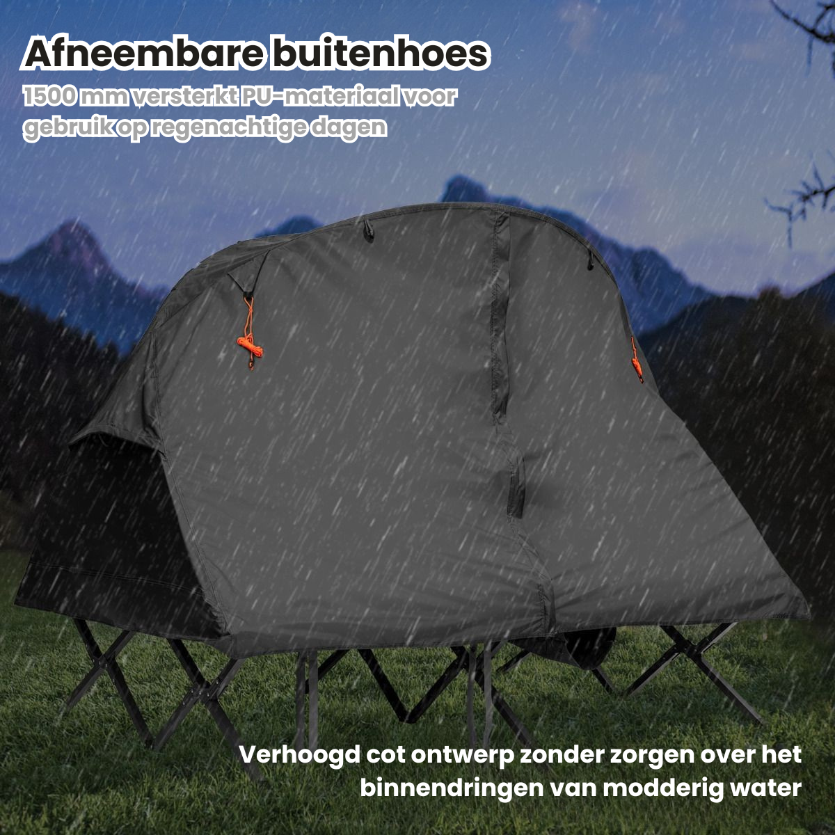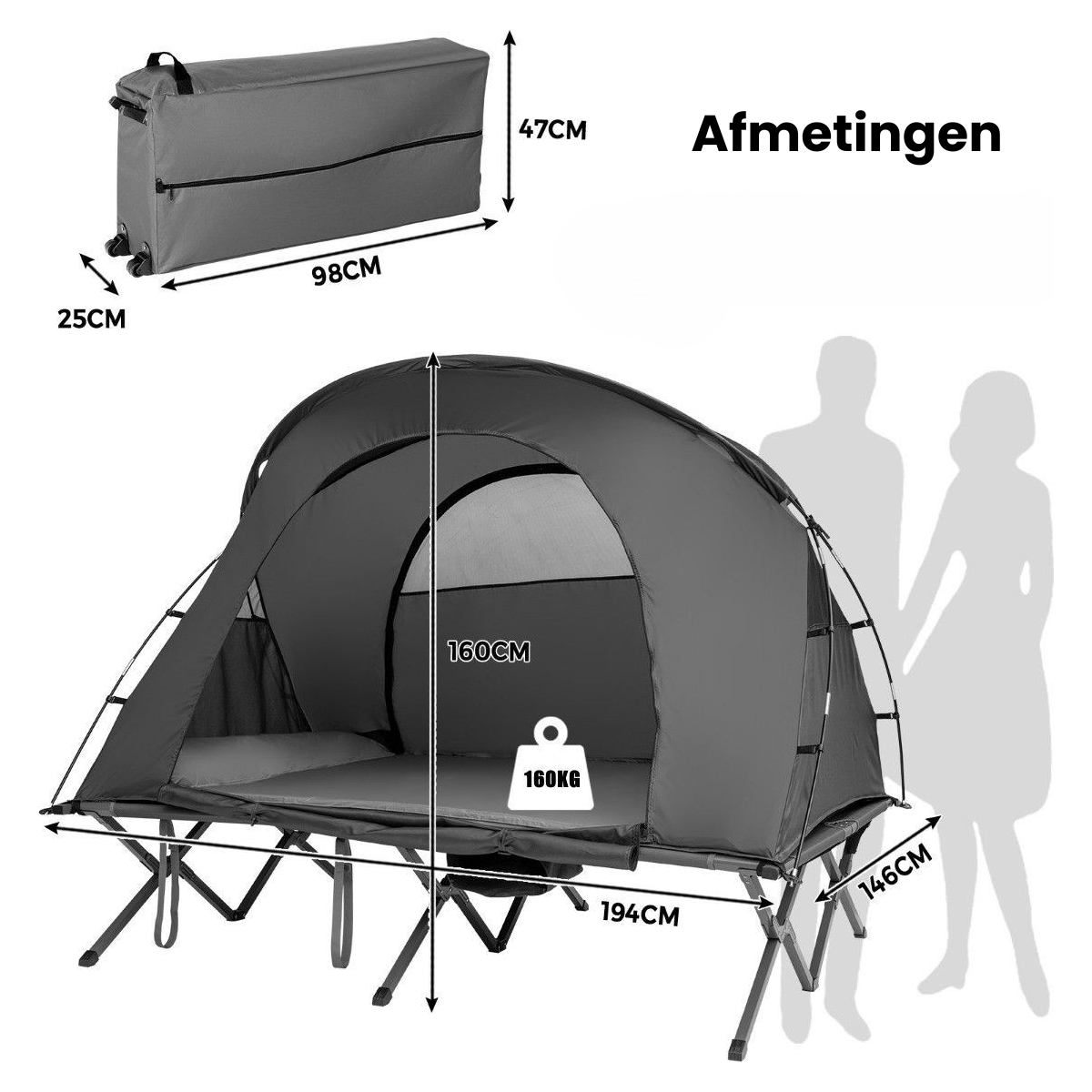 Dankzij het verhoogde ontwerp slaap je boven de koude, natte grond – beschermd tegen vocht, vuil en insecten. De tent is ontworpen voor 2 personen, eenvoudig op te zetten én compact op te vouwen in de meegeleverde draagtas.