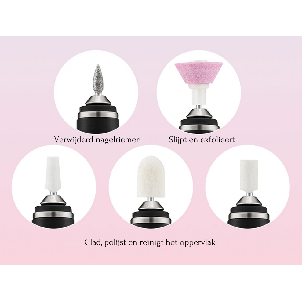 In de set zijn 5 vervangbare tips inbegrepen: een cilindrische punt voor polijsten, een conische punt voor nagelriemen, een puntige punt voor precisiewerk, een kleine cilindrische punt voor fijner polijsten en een afgeronde punt voor matteren en egaliseren van de nagelplaat.