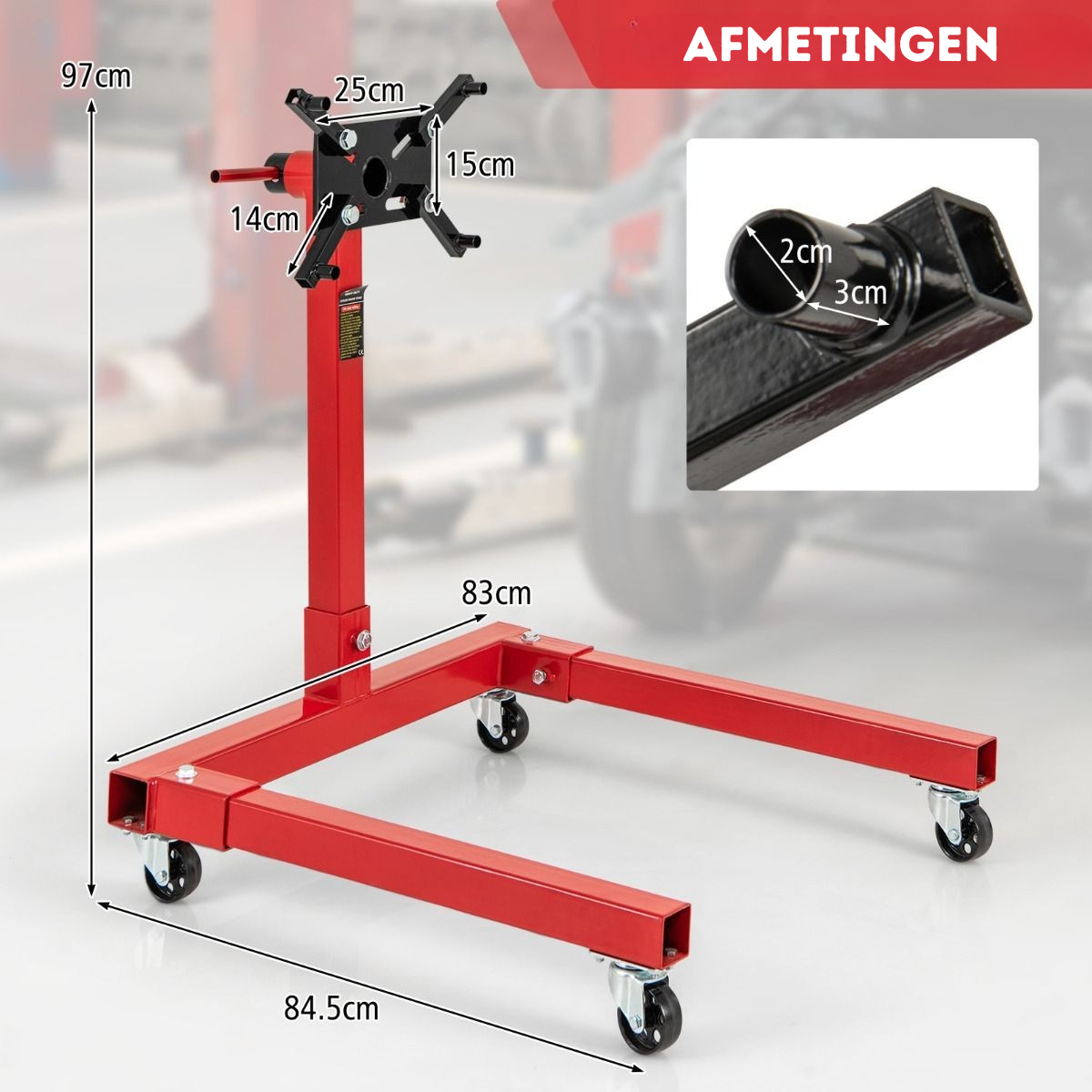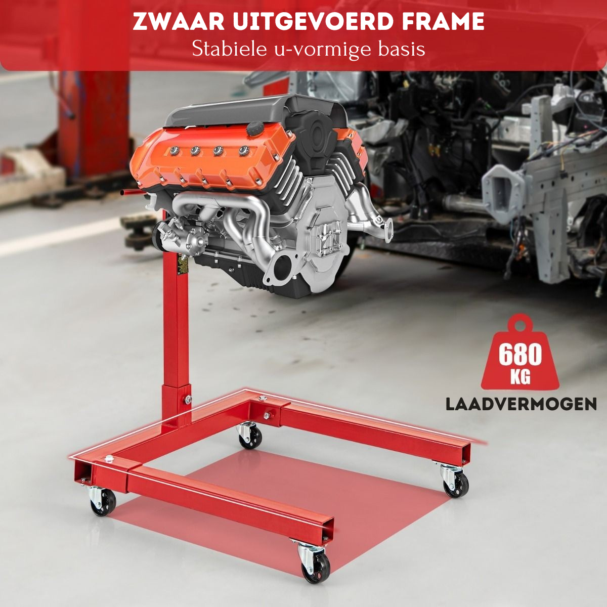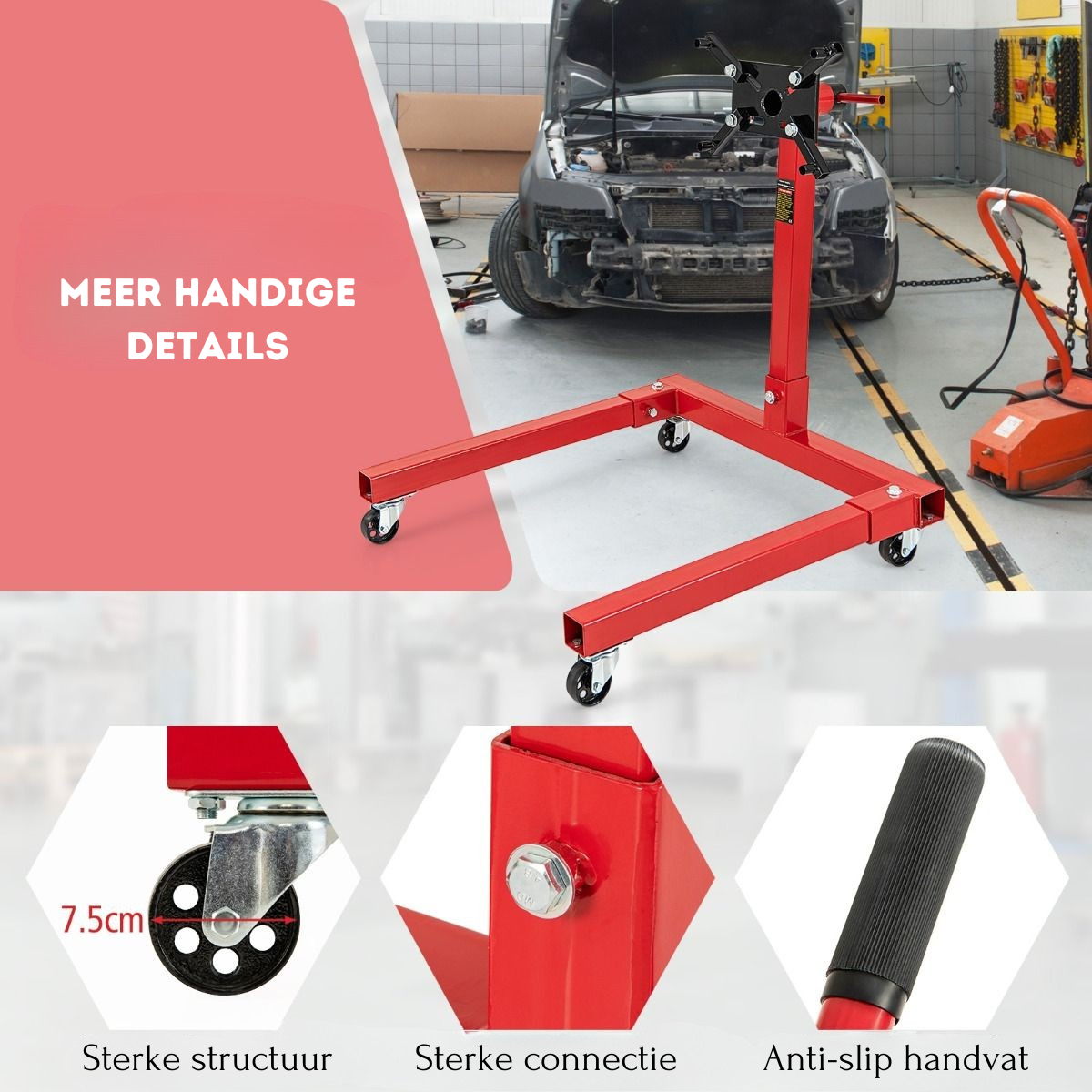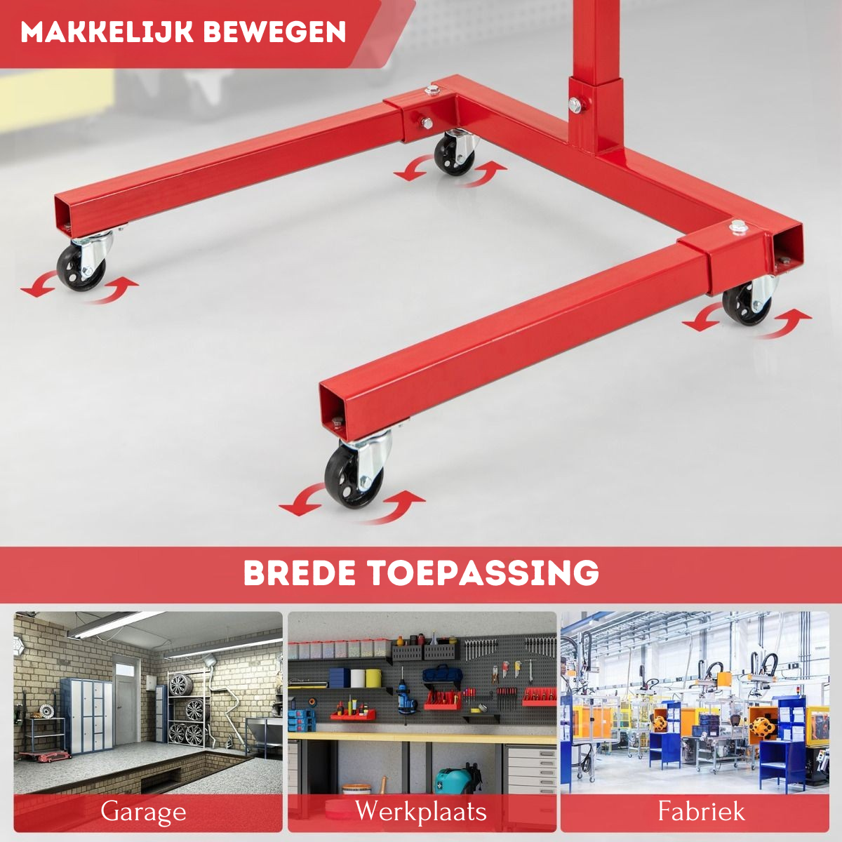 Deze motorsteun is voorzien van een U-vormige basis en sterk metalen materiaal voor duurzaamheid. Met 4 zwenkwielen is hij gemakkelijk te verplaatsen voor gebruik in huisgarages en professionele werkplaatsen.