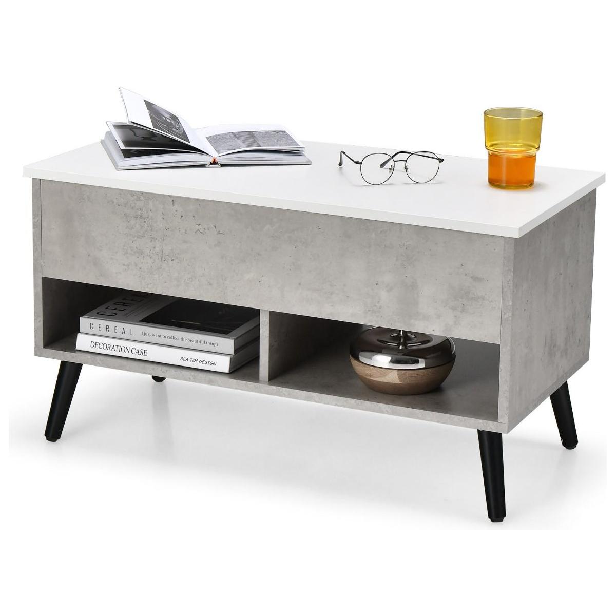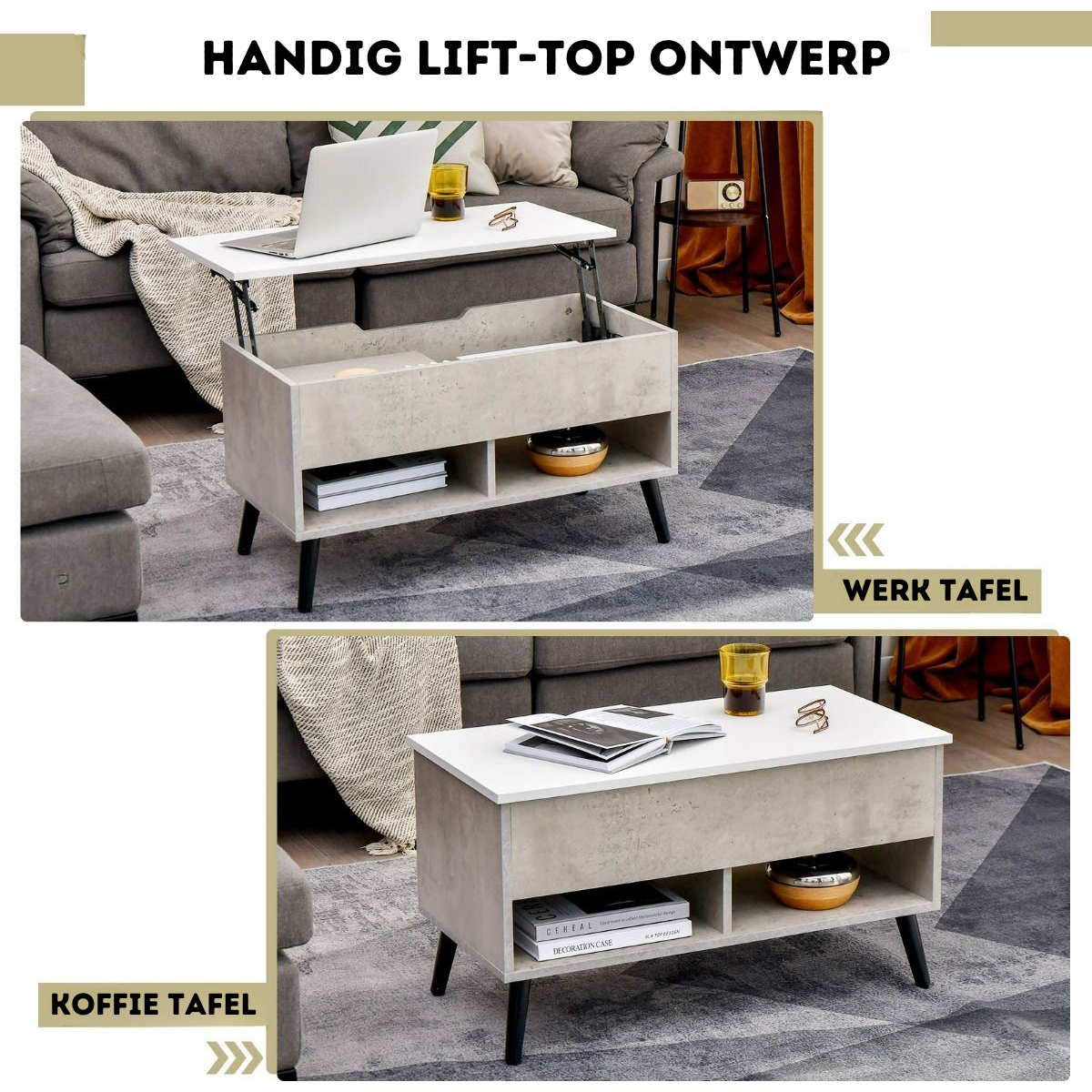 De salontafel heeft een groot verborgen vak en 2 open schappen, wat zorgt voor voldoende opbergruimte voor alledaagse voorwerpen.