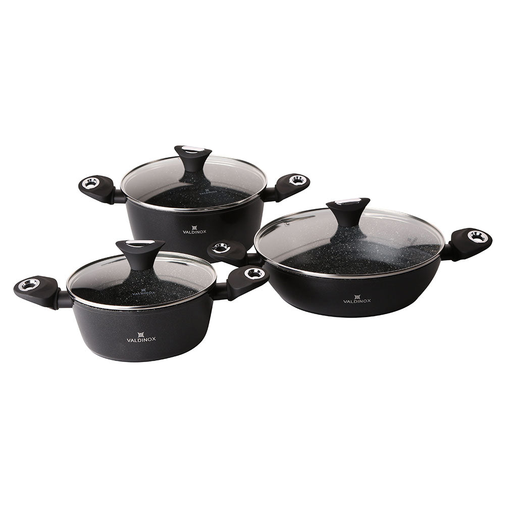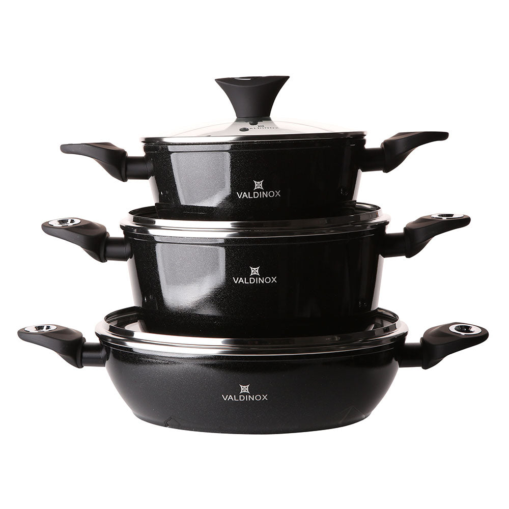 Bent u opzoek naar een nieuwe kookpannenset? Dan is deze 6-delige set van Valdinox misschien wel wat voor jou. Gemaakt van hoogwaardige materialen wat er voor zorgt dat je jarenlang plezier van deze pannenset kan hebben. De meer laags keramische coating zorgt ervoor dat het voedsel niet blijft plakken. Door de gehard glazen deksels kan je het te bereiden voedsel gemakkelijk in de gaten houden.