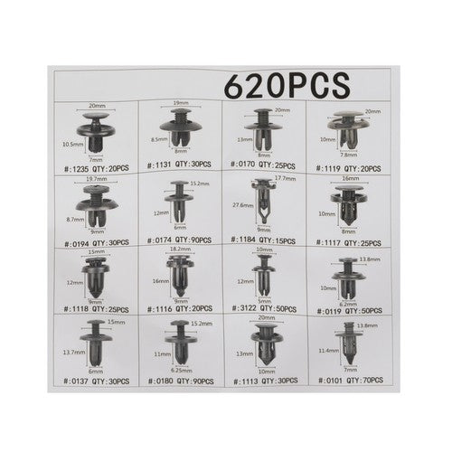 De kunststof klinknagels bumper bevestiging schroeven 620 delig set bevat verschillende maten en soorten clips, gemaakt van duurzaam PP-materiaal voor een solide montage en langdurig gebruik. Daarnaast wordt de set geleverd in een handige plastic doos voor eenvoudige opslag en organisatie.
